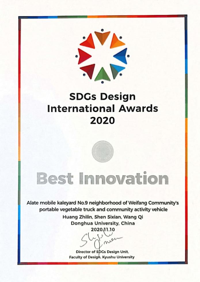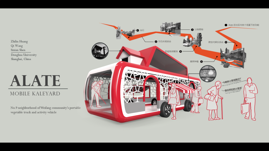 本次东华大学代表团队Alate的参赛作品,基于对上海浦东潍坊九村的实地调研,了解到在流行病期间小区关闭了几个入口,进而挖掘了老年人难以购买蔬菜的需求痛点。此外,团队观察到社区内部的合作和人际交流因隔离而减弱,因此设计了“Alate Mobile Kaleyard”,它不仅是一辆可以引进小区原有的蔬菜供应资源的蔬菜车,还是鼓励生活在同一个社区里的不同人群交流的社区活动工具,可实现功能包括种植蔬菜和举办社区老物件展览等。它不仅为购物提供了便利,而且旨在重振社区代际联系。